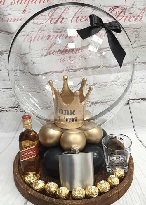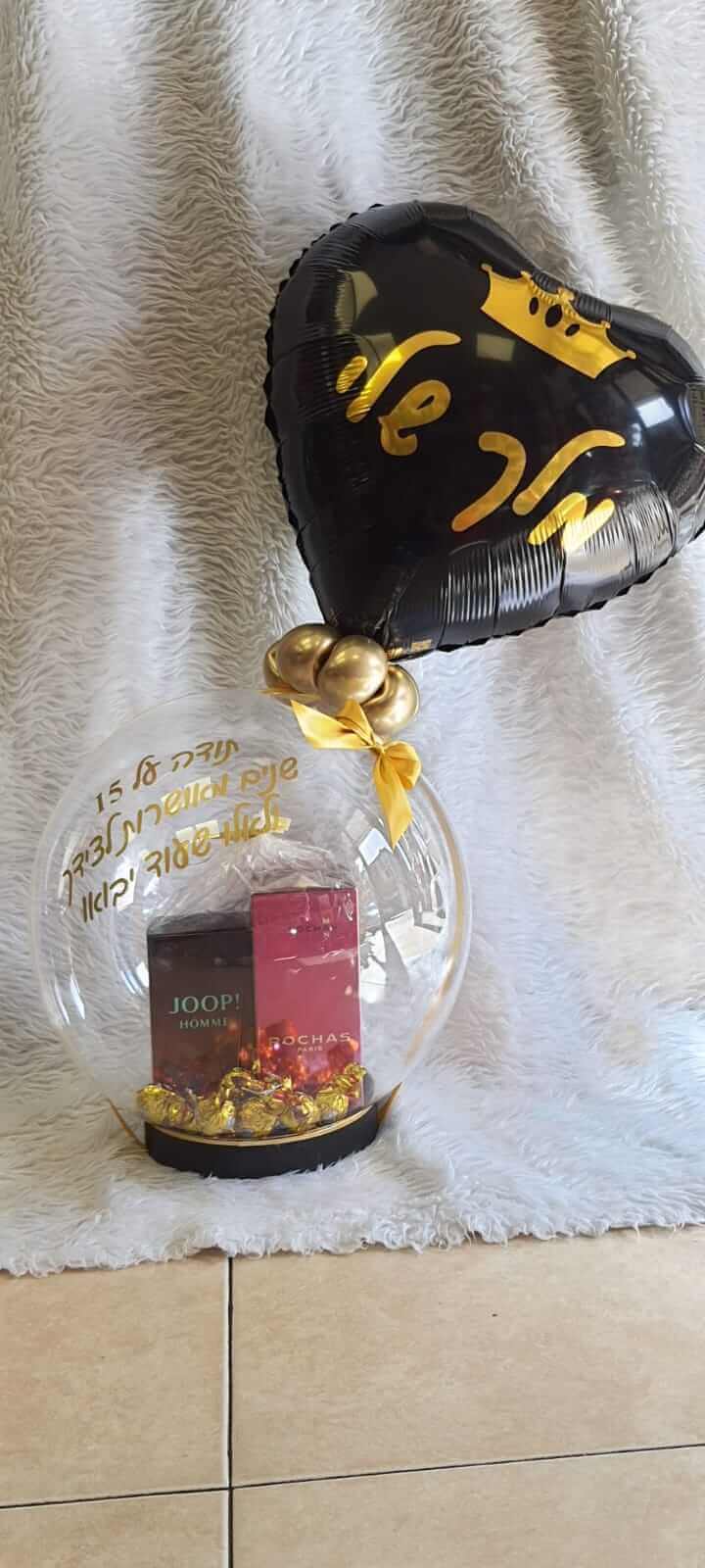 באפשרותכם להזמין בלון העטוף בקישוטים שונים, או ממש מתנה בתוך בלון כשהכל מונח על בלונים קטנים בצבעים תואמים ומארז מתנה עם שוקולדים ושלל הפתעות נוספות.