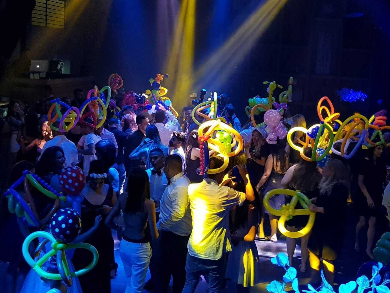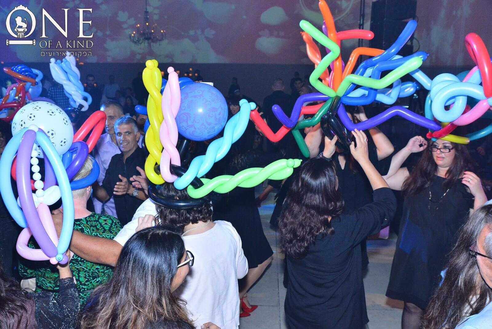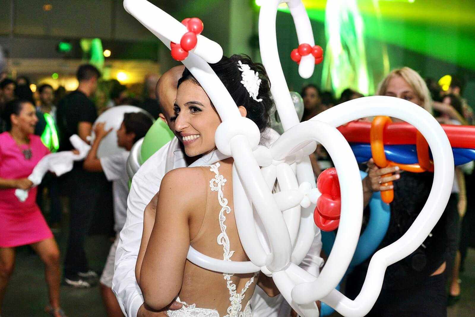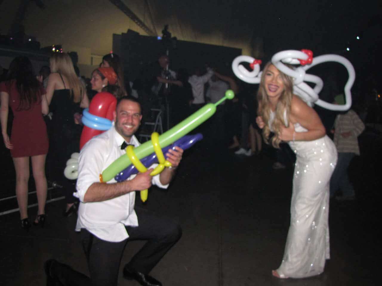 בתחילת האירוע, אנחנו בבלונים זה הכול דואגים להכין בלוני צורות עבור הילדים שהגיעו לחתונה, ומקפל לכל אחד מהם בלון צורה אישי ומיוחד. לאחר מכן, אנחנו דואגים להפוך את רחבת הריקודים בחתונה למסיבה צבעונית, ייחודית שלא תמצאו כמותה. עבור אלה המעוניינים, ישנה אפשרות שאמן הבלונים יעבור גם בין השולחנות של מי שקשה להם לקום ולרקוד, וידהים אותם ביצירותיו. האורחים הללו ידעו להודות לכם על כך שחשבתם גם עליהם. תהליך הכנת הבלון יעשה מול עיניהם המשתאות, והוא ילווה בהומור רב, ובטכניקות קיפול שישאירו את כולם פעורי פה.