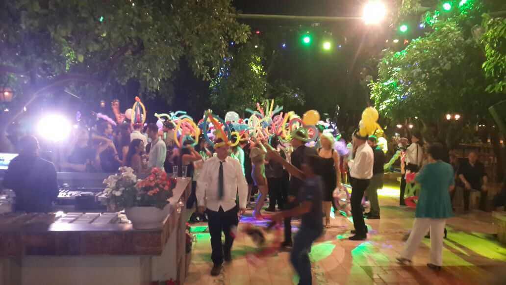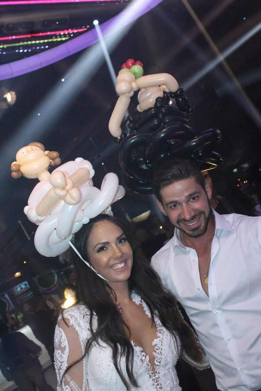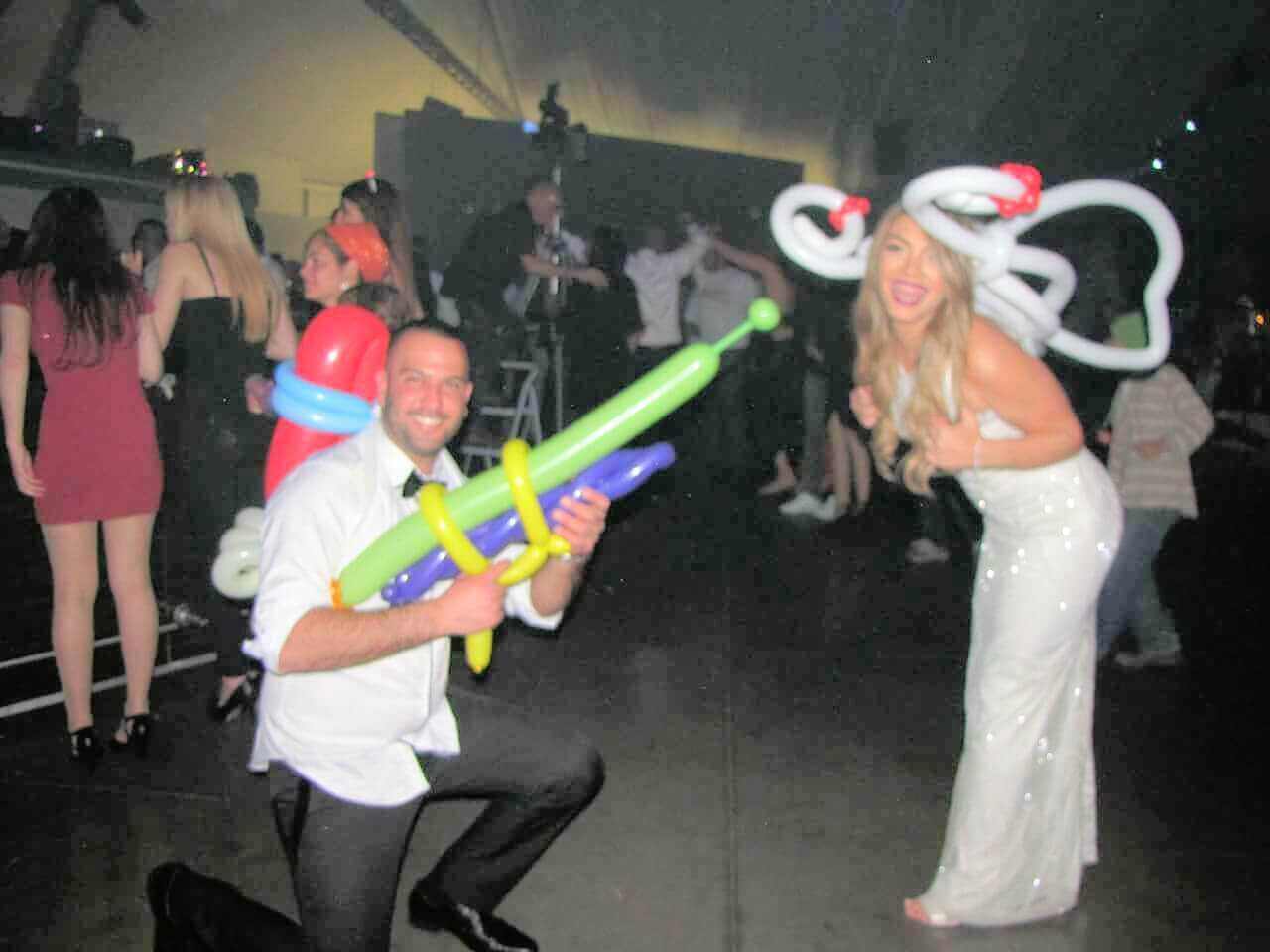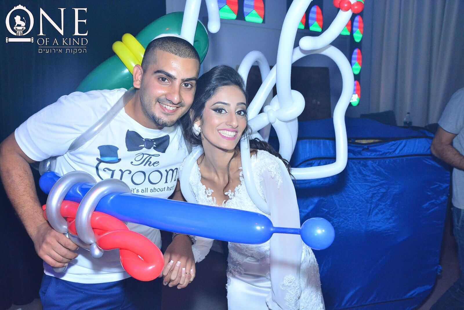 בתחילת האירוע, אנחנו בבלונים זה הכול דואגים להכין בלוני צורות עבור הילדים שהגיעו לחתונה, ומקפל לכל אחד מהם בלון צורה אישי ומיוחד. לאחר מכן, אנחנו דואגים להפוך את רחבת הריקודים בחתונה למסיבה צבעונית, ייחודית שלא תמצאו כמותה. עבור אלה המעוניינים, ישנה אפשרות שאמן הבלונים יעבור גם בין השולחנות של מי שקשה להם לקום ולרקוד, וידהים אותם ביצירותיו. האורחים הללו ידעו להודות לכם על כך שחשבתם גם עליהם. תהליך הכנת הבלון יעשה מול עיניהם המשתאות, והוא ילווה בהומור רב, ובטכניקות קיפול שישאירו את כולם פעורי פה.