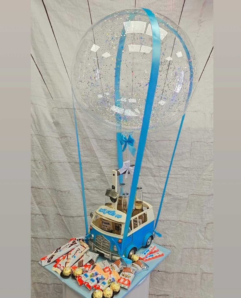מארז בעיצוב ואן עם בירות ובלון שקוף ענק