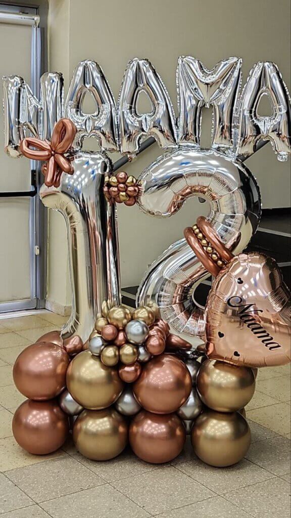 בלונים זה הכל » בלונים לבת מצווה » מעמד בלונים 12 זהוב כסוף ואותיות בלון